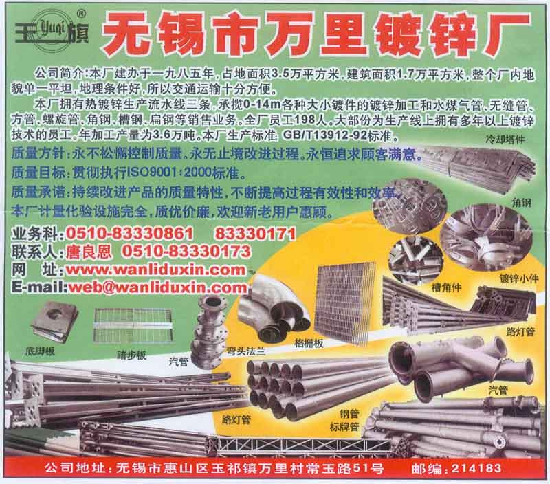 無錫市萬里鍍鋅廠 聯系人:諸惠芬 女士 E-mail:web@wanliduxin.com 地址:無錫市玉祁鎮萬里村常玉路51號 電話:0510-83330861 83330171 83330173 傳真:請登錄后查看 郵編:214183 網址:http://www.wanliduxin.com