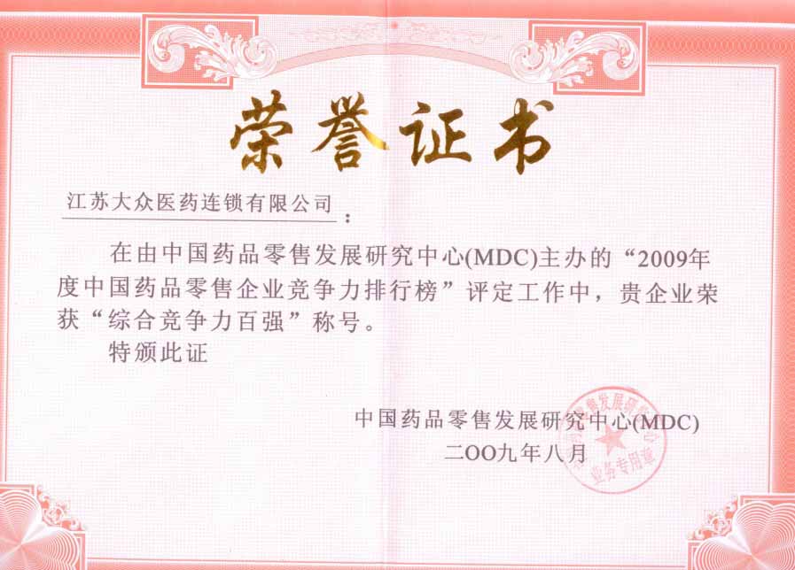 大眾醫藥,以服務回報社會,提高人民大健康意識,發展醫藥事業為宗旨,連續多年被省市各級政府授予多項榮譽稱號。連鎖機構擁有直營門店100多家,是江蘇省連鎖藥店領頭企業。有限公司在09年年底正式取得江陰地區的基本藥物配送權,致和堂飲片公司是無錫地區最先通過國家GMP認證的中藥生產企業,百年老店“致和堂”被國家商務部授予“中華老字號”稱號,是無錫地區唯一一家百年老字號藥店,其膏滋藥傳統制作工藝被授予國家級非物質文化遺產稱號!