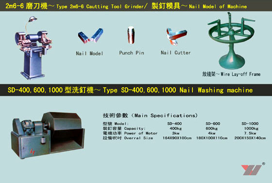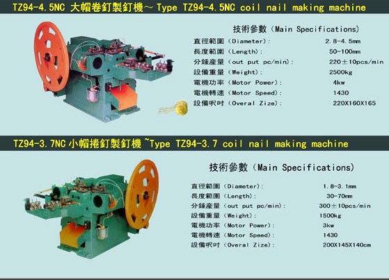 第一條線,生產Z94系列泉自動制釘機及各種輔助設備,產品型號齊全,使用于制造各種規格的普通鋼釘及異型釘、如油氈釘、瓦楞釘、雙帽釘、U型釘、麻花釘、水泥釘等。