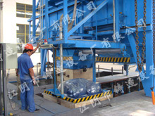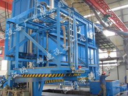 此技術(shù)已申請(qǐng)國(guó)家專利 1、自動(dòng)翻箱、合箱機(jī) 由翻合箱臺(tái)、機(jī)械手、小車系統(tǒng)、翻箱裝置、液壓站(或氣動(dòng))、PLC電控等組成。有效提高自動(dòng)化程度及合箱精度,可克服人工合箱時(shí)碰撞損壞型腔。驅(qū)動(dòng)采用日本住友減速變頻電機(jī)。 工作時(shí)機(jī)械手小車運(yùn)行到下箱起模工位(可以不用起模機(jī)),機(jī)械手直接起模并完成翻箱工作,后運(yùn)行至合箱工位將翻箱完成后的下箱放好;然后機(jī)械手小車運(yùn)行到上箱起模工位,機(jī)械手起模,后運(yùn)行至合箱工位將上箱放下完成合箱。 自動(dòng)翻合箱機(jī)適用于泥芯較少的工件造型線。 2、翻、合箱機(jī) 由翻合箱臺(tái)、運(yùn)載小車系統(tǒng)、翻合箱裝置(含機(jī)械手)、液壓站(或氣動(dòng))、PLC電控等組成。有效提高機(jī)械化程度和安全生產(chǎn)。翻箱時(shí)人工輔助,機(jī)械手合箱。其結(jié)構(gòu)簡(jiǎn)單可靠,便于調(diào)節(jié),操作方便,可克服人工合箱時(shí)碰撞損壞型腔,提高合箱精度。驅(qū)動(dòng)采用日本住友減速變頻電機(jī)。