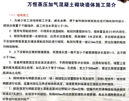 產品名稱:萬恒蒸壓加氣混凝土砌塊墻體施工簡介