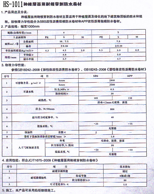 產品名稱:HS-1011種植屋面用耐根穿刺防水卷材
