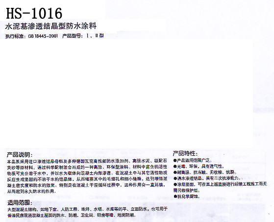產品名稱:HS-1016水泥基滲透結晶防水涂料